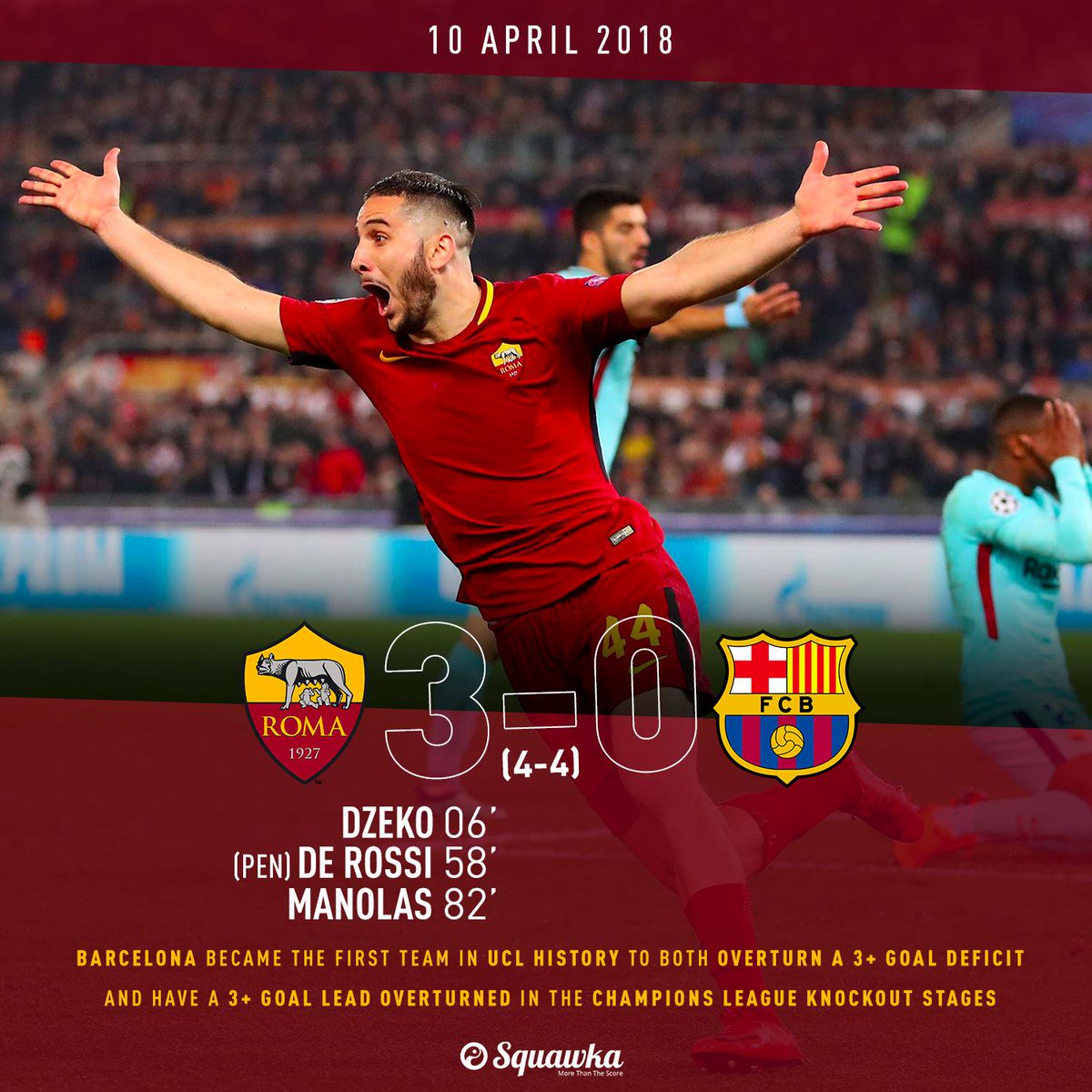 Il 10 aprile 2018, la Roma ha sconfitto il Barcellona per 3-0 allo Stadio Olimpico, compiendo una delle rimonte più iconiche nella storia della UEFA Champions League. Dopo aver perso la gara d'andata dei quarti di finale per 4-1 al Camp Nou, i giallorossi si sono qualificati per le semifinali grazie alla regola dei gol in trasferta (punteggio aggregato di 4-4)